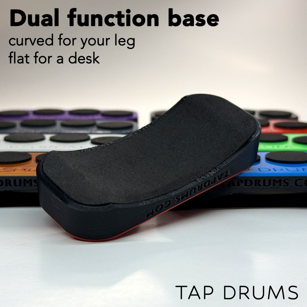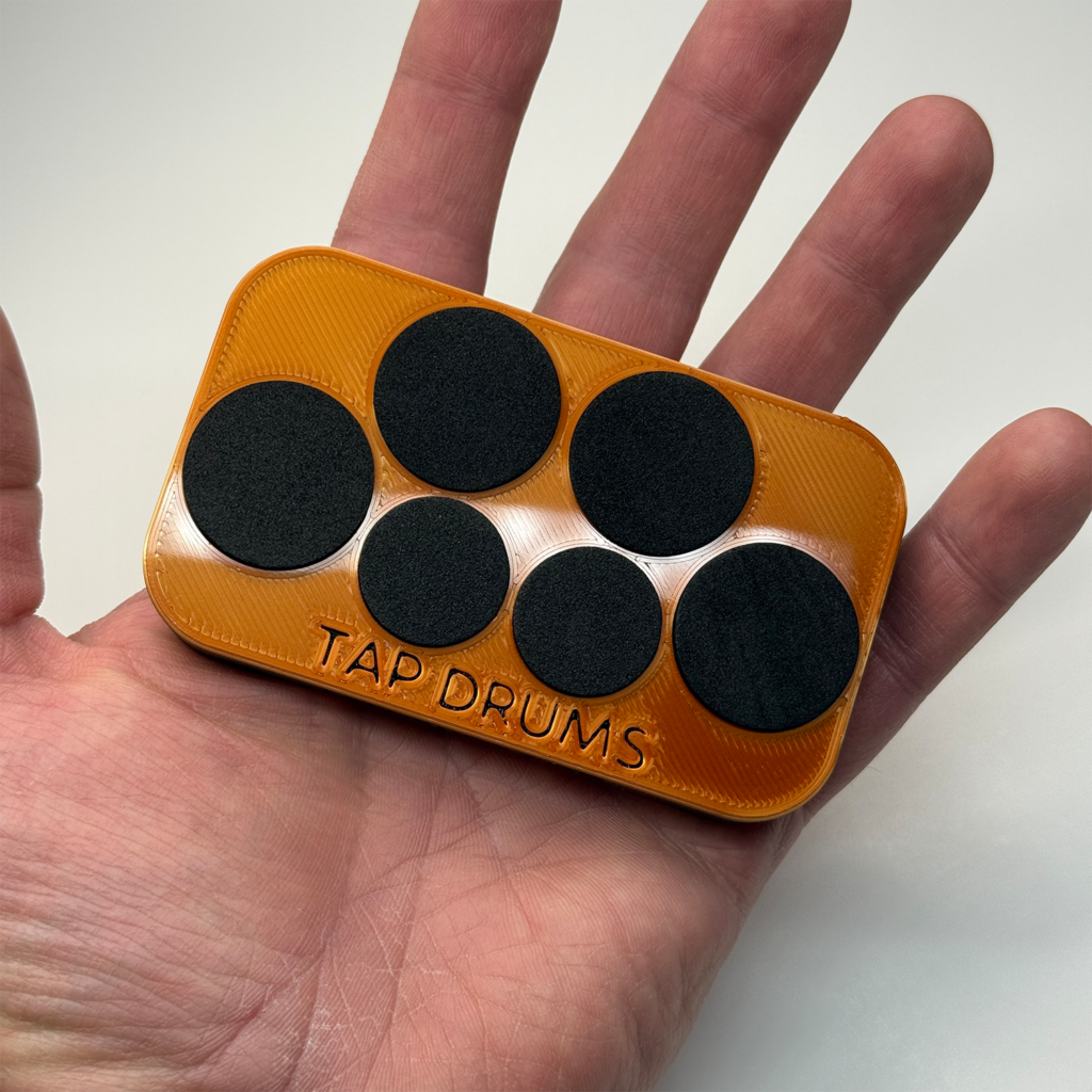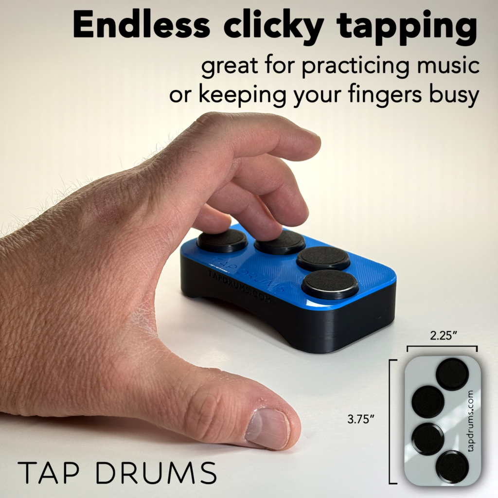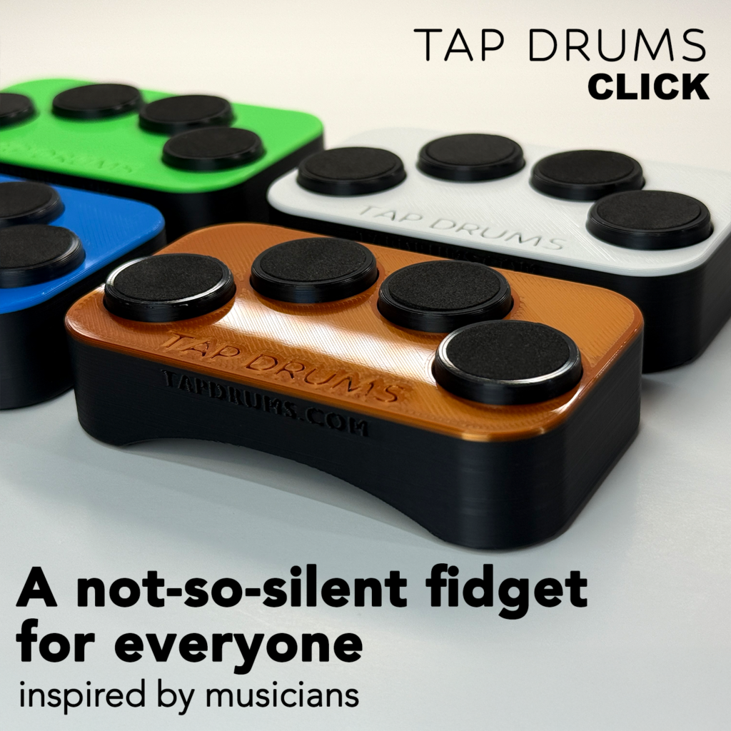 Tap Drums is an intentionally silent, pocket-sized fidget. A differentiating feature in the vast landscape of clicking fidgets. Tap Drums is a high quality, solid device made of hard plastic and durable foam. It has soft foam pads you tap with your fingers, sits nicely on your leg or a table, and you can take it anywhere. Tap Drums is great for anyone (musicians, fidgeters, students, work colleagues) who find themselves tapping on their leg, desk, dashboard, armrests, you name it. It’s silent, so you can tap all day long without disturbing anyone.